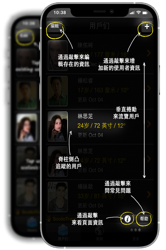 脊柱側彎跟蹤Pro結合了脊柱側彎斜度計的準確性,一種醫生用來測量脊柱側彎的儀器,並能夠通過手機上的攝像頭跟蹤一個人的身高、體重和姿勢變化。
