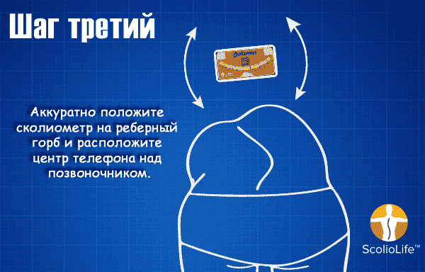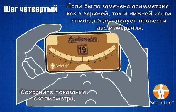 Сколиометр измеряет степень искривления туловища. Пациента просят наклониться, свесив руки и прижав ладони друг к другу, пока в грудном отделе (верхняя часть спины) не появится изгиб. Сколиометр помещается на спину и используется для измерения вершины (самой высокой точки) изгиба. Затем пациента просят продолжать наклоняться, пока не будет виден изгиб в нижней части спины; затем измеряется вершина этого изгиба.